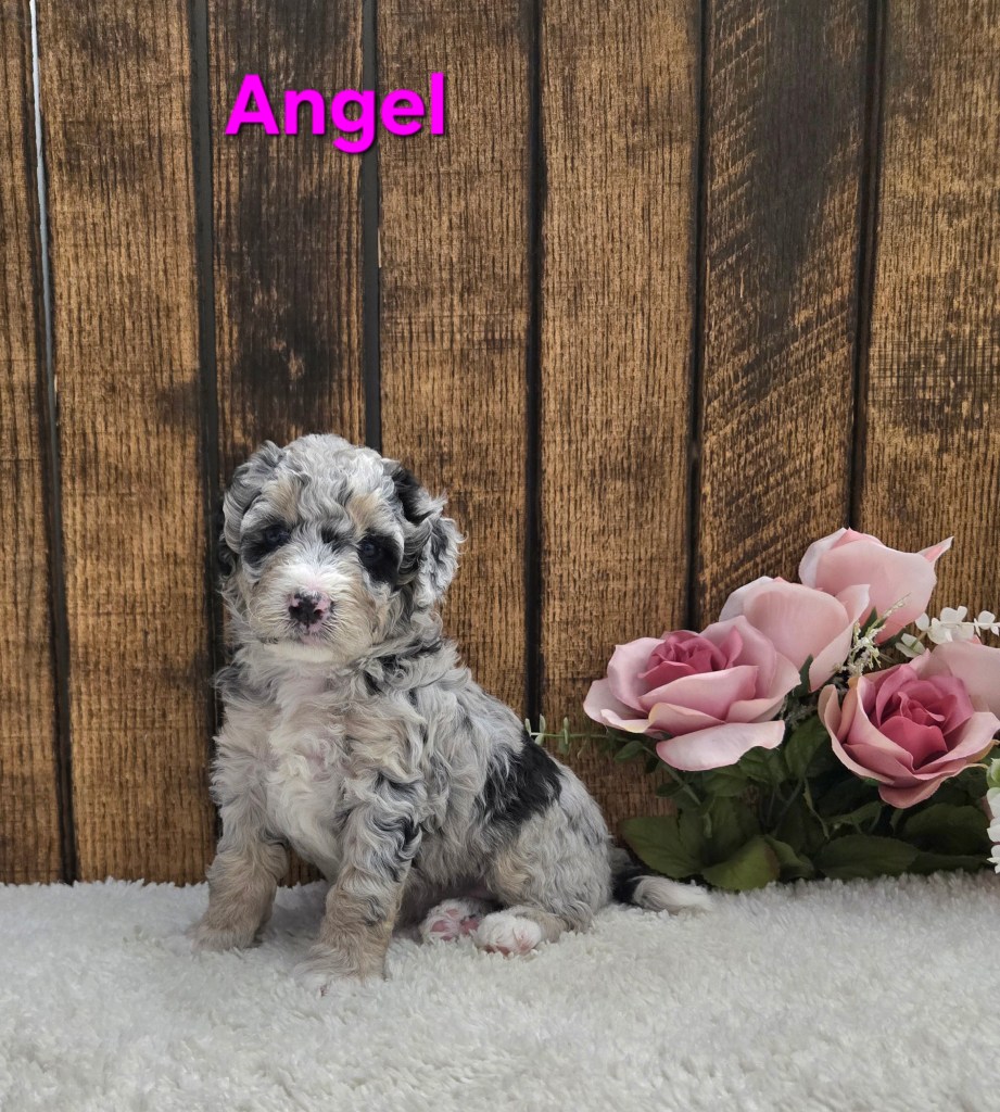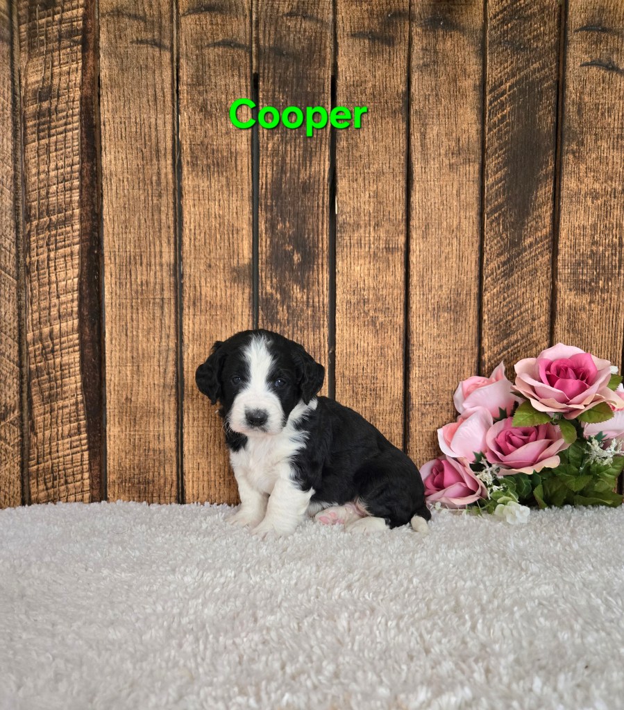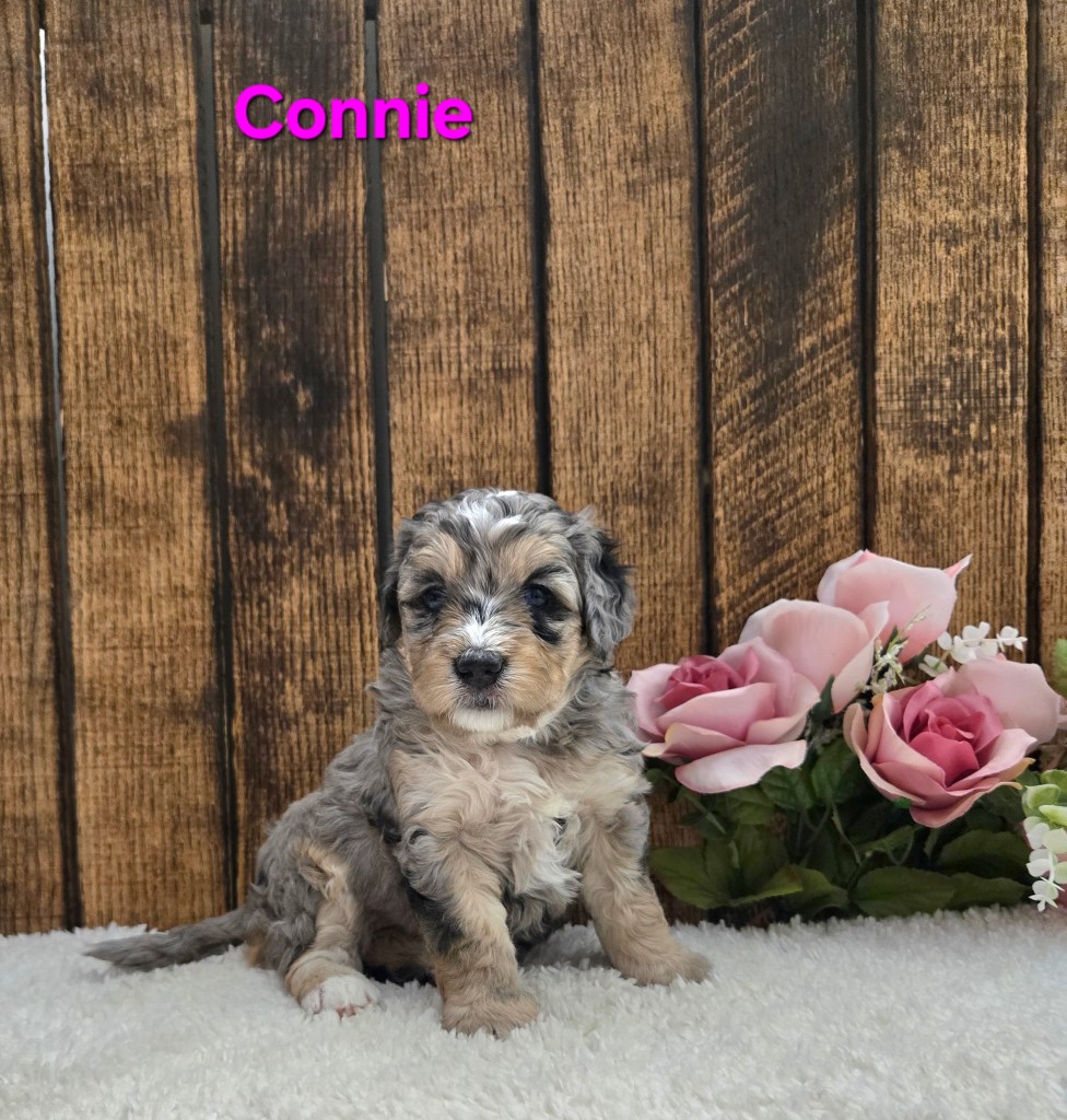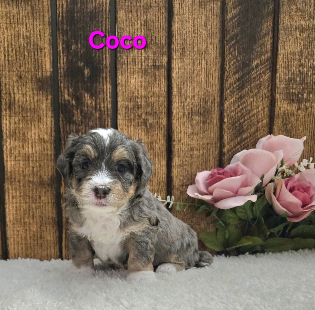 “Adorable F1b Mini Bernedoodle- Born February 23rd, Ready by April 18th. Full grown 25-35 lbs”.