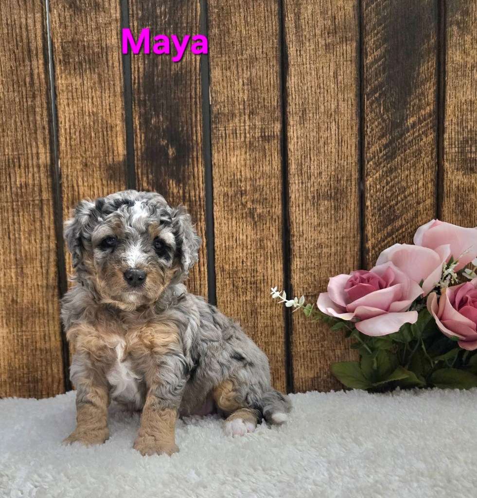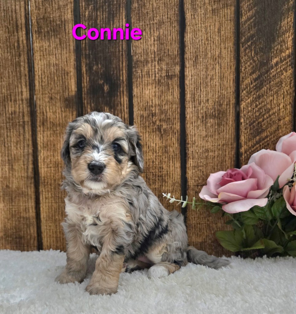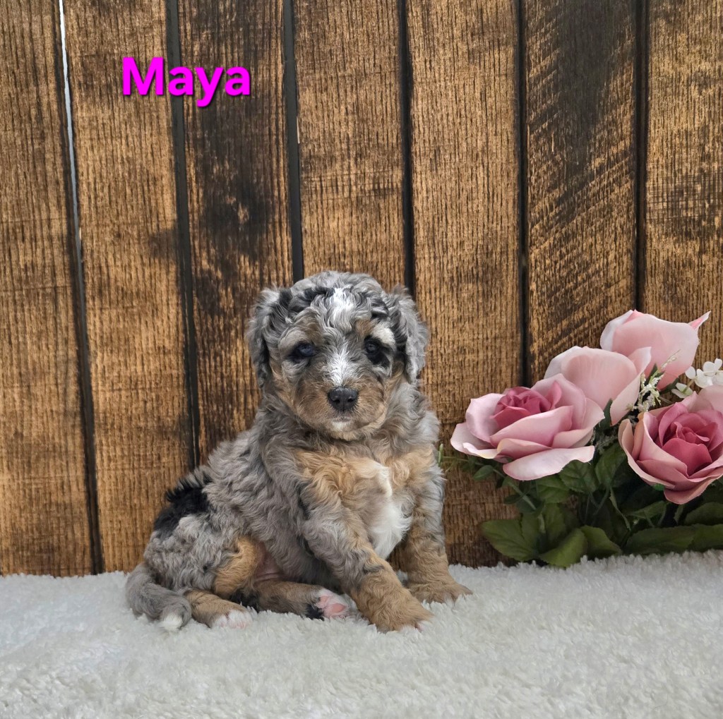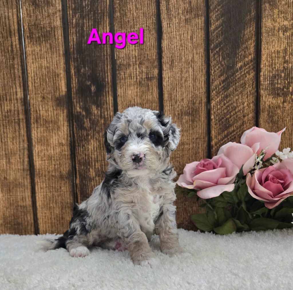“Adorable F1b Mini Bernedoodle- Born February 23rd, Ready by April 18th. Full grown 25-35 lbs”.