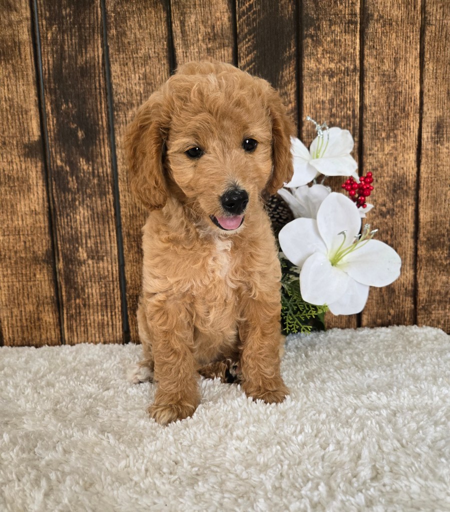 Ruby is a sweet mini Goldendoodle puppy born on February 15th,and she’s now ready to go her forever homes! She’s friendly, cuddly, and up to date on vaccinations-ready to bring joy to your family.